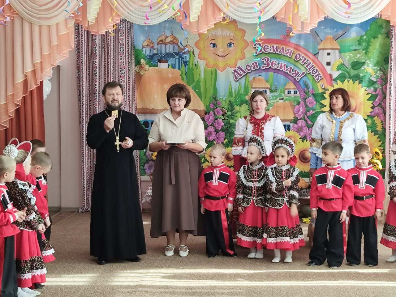 Отец Виталий обратился к участникам мероприятия с пастырским словом, подчеркнув значение веры в жизни каждого человека и важность сохранения нравственных ориентиров, благословил юных казачат и вручил каждому икону, а детскому саду икону святителя Спиридона Тримифунтского.