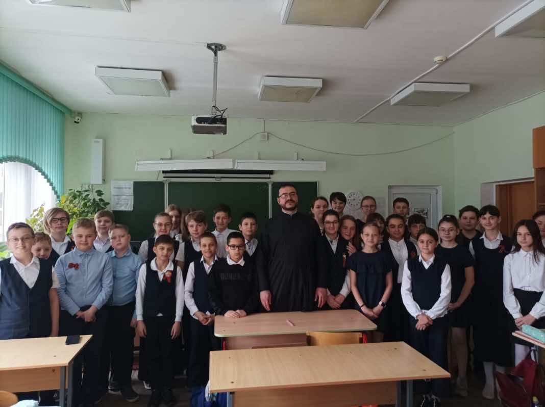 В преддверии праздника Светлого Христова Воскресения 21 апреля штатный клирик храма Покрова Пресвятой Богородицы диакон Евгений Дасов провел очередную встречу с учениками пятых классов гимназии № 44 имени Михаила Тальского.