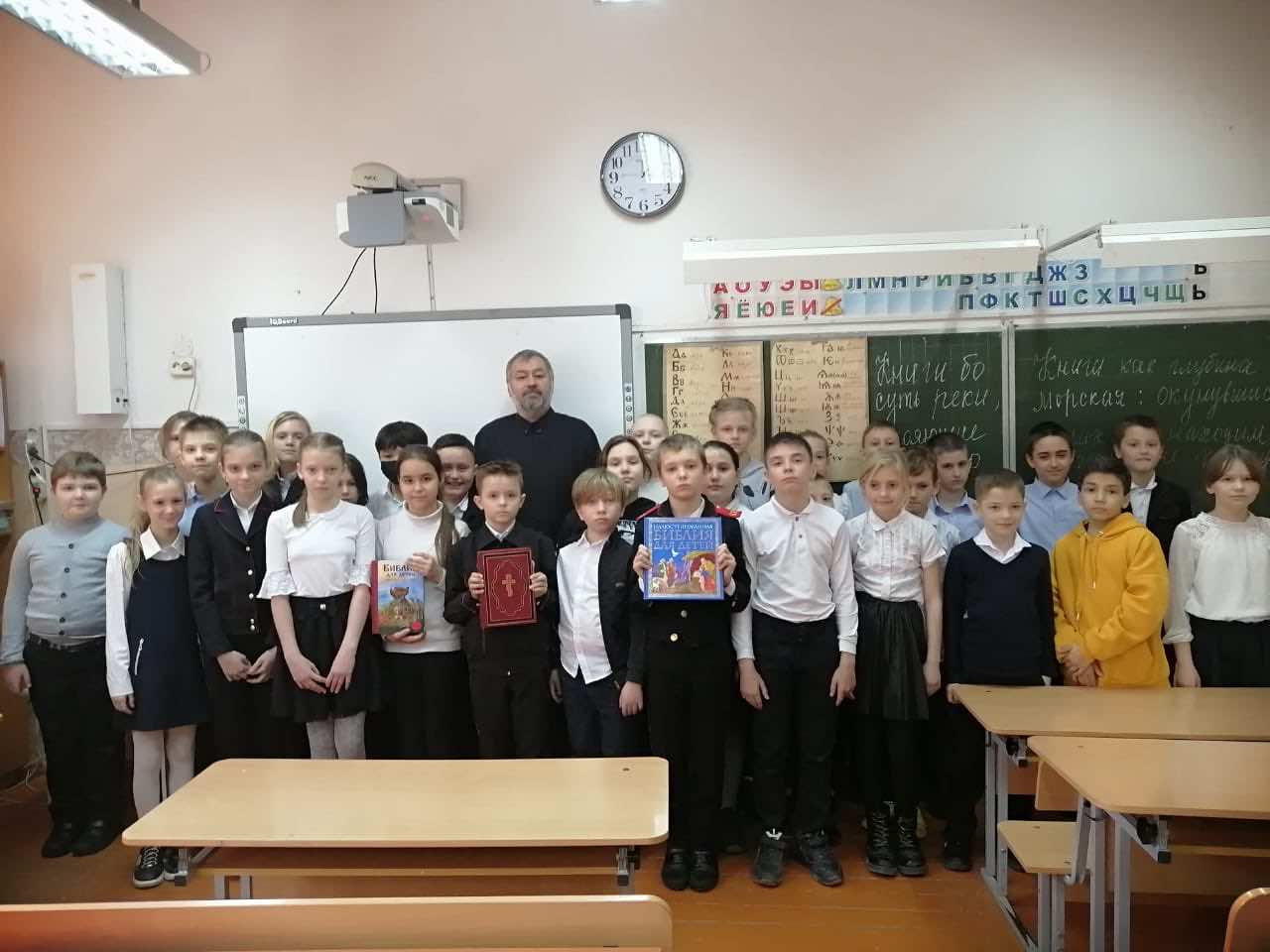 По благословению благочинного 3-го Краснодарского городского благочиннического округа протоиерея Георгия Меденцева в школе № 60 состоялась встреча штатного клирика храма Вознесения Господня диакона Евгения Ромазева и библиотекаря школы Адайкиной Ольги Николаевны с учениками 4-го класса.