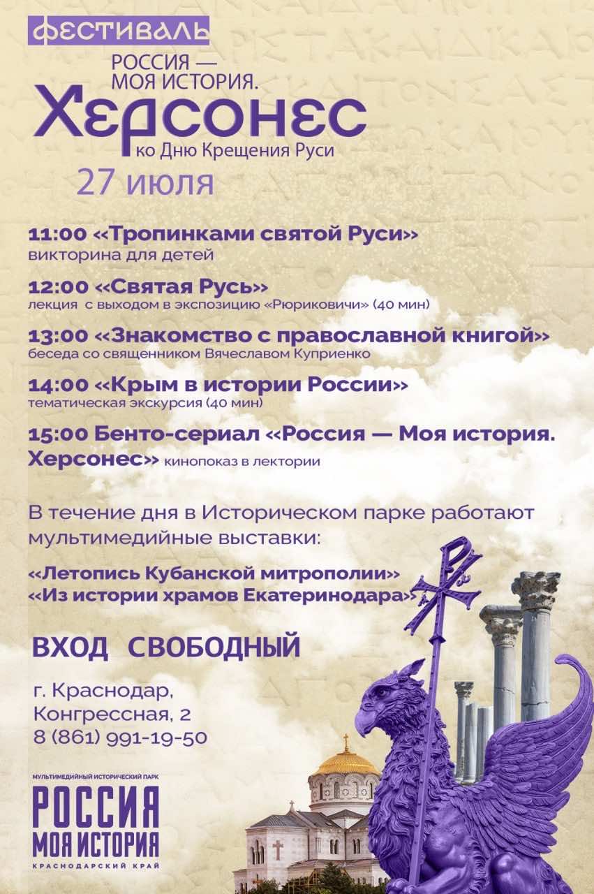 В преддверии празднования Дня Крещения Руси Исторический парк «Россия-моя история» подготовил для жителей и гостей города праздничную программу. 27 июля в парке будут работать тематические выставки «Летопись Кубанской митрополии» и «Из истории храмов Екатеринодара», для маленьких посетителей пройдет познавательная викторина «Тропинками святой Руси». Погрузиться в историю можно будет на интерактивной лекции «Святая Русь» и на тематической экскурсии «Крым в истории России». Все желающие смогут принять участие в интересной беседе со священником Вячеславом Куприенко, который покажет старинные православные книги и расскажет об истории их создания.