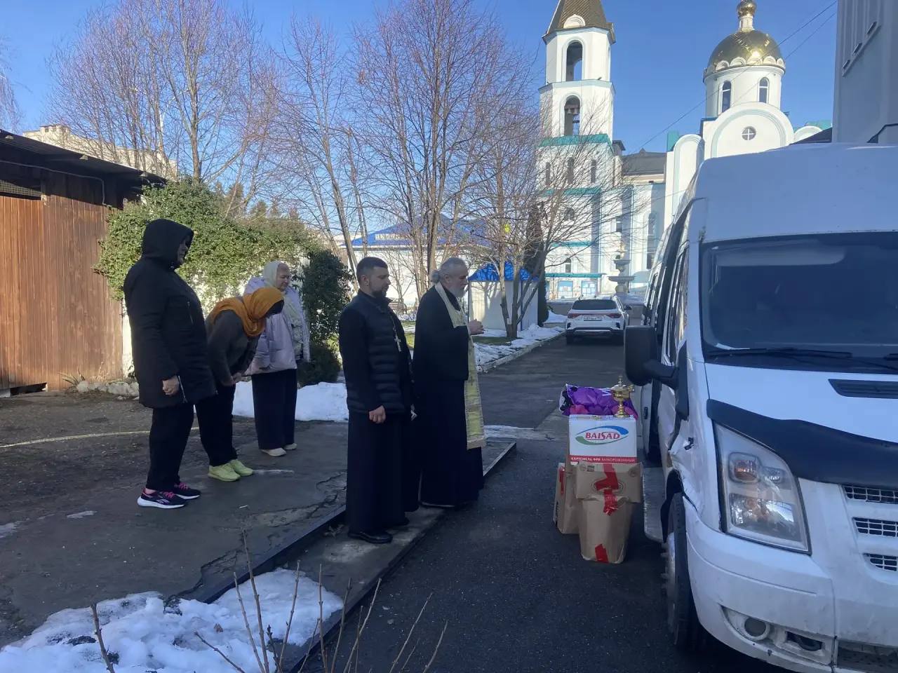 Настоятель Покровского храма протоиерей Геннадий Волков и штатный клирик храма иерей Андрей Овчинкин совершили чин освящения автомобиля, который доставит помощь до адресатов, окропили груз и волонтёров святой водой.
