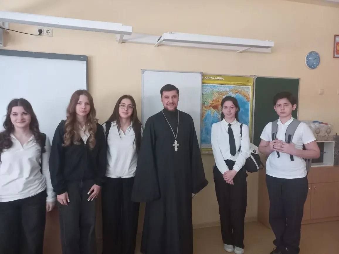 23 марта настоятель храма Вознесения Господня пос. Южного иерей Давид Кочаров посетил МАОУ СОШ №15 и встретился с учащимися 5 «В», 10«Г», 8 «Ж», 8«А» и 6 «К» классов.
