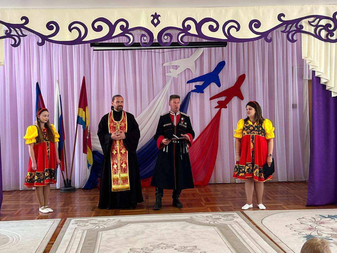 На торжественную церемонию собрались: атаман Васюринского ХКО Павел Кашпур, казаки-наставники, преподаватели и учащиеся казачьей школы школы № 14, воспитатели детского сада, духовенство.