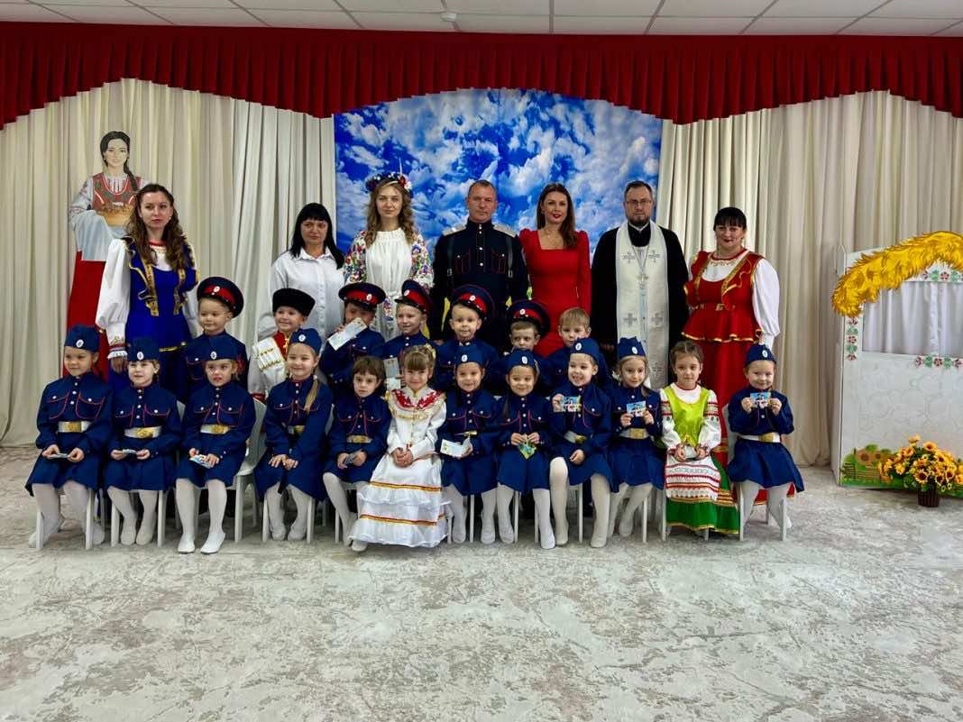 Перед началом торжества батюшка прочитал молитву, призывая Божие благословение на детей, а по окончании окропил всех юных казачат святой водой.