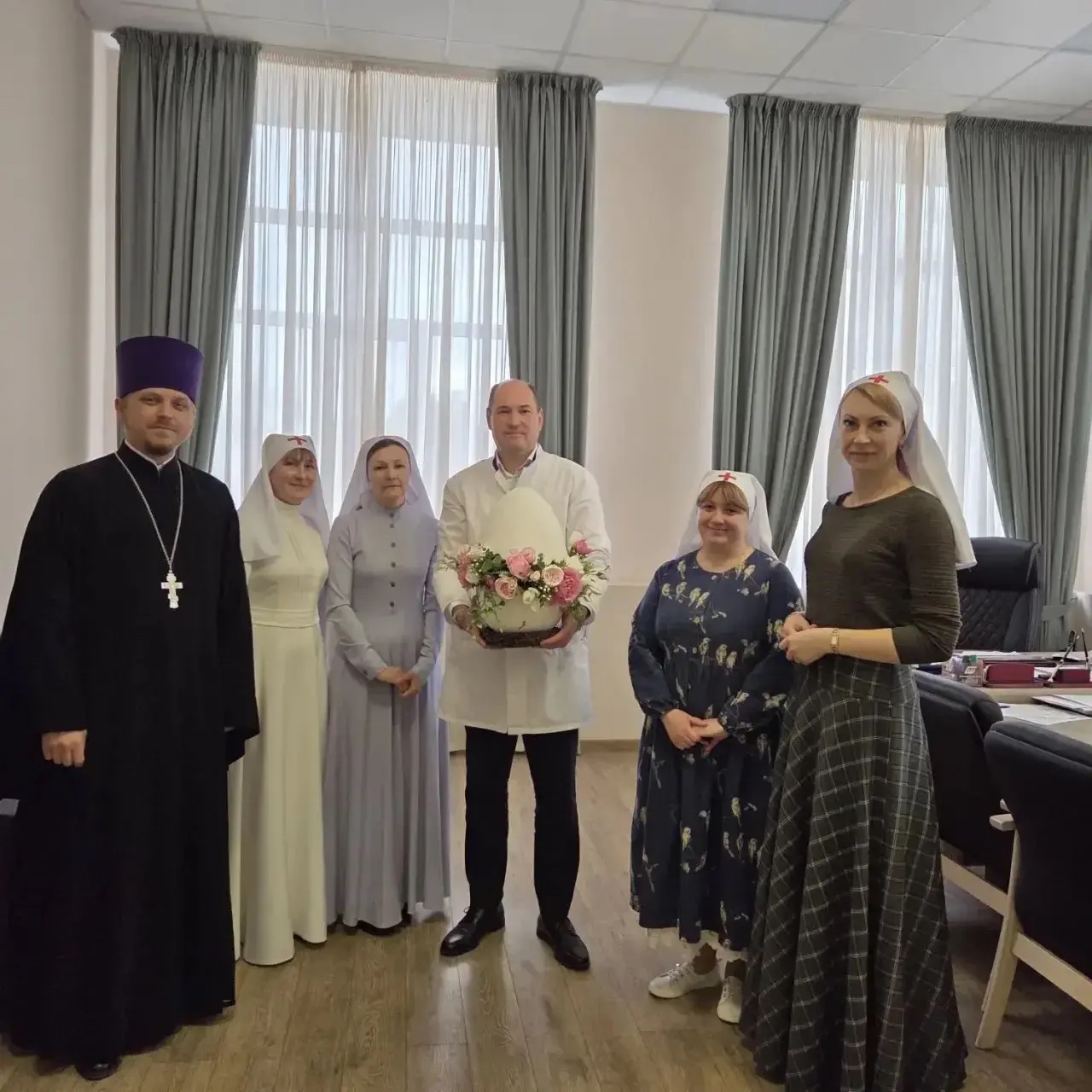 Настоятель храма святителя Луки Крымского, руководитель больничного направления социального отдела епархии иерей Иоанн Усачёв вместе со старшими сёстрами сестричеств, трудящихся в отделениях больницы скорой медицинской помощи, поздравил главного врача больницы — Босака Николая Владимировича — со светлым праздником Пасхи.