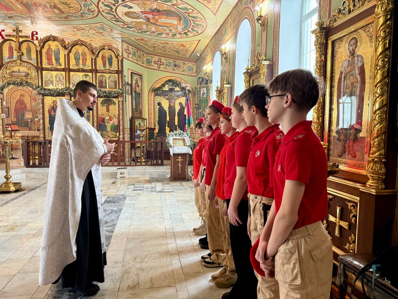 После молитвы юнармейцев провёл в конференц-зал диакон Роман Ермаков, помощник благочинного по миссионерскому служению. Отец Роман провёл с гостями содержательную беседу, посвящённую предстоящему великому празднику – Крещению Господню. Он рассказал о его глубоком духовном смысле и традициях.