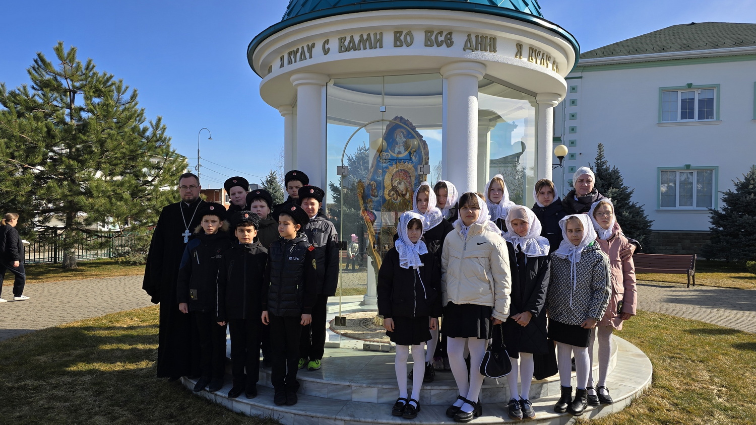 Ребят встретил штатный священник храма иерей Георгий Белан. Священник совершил для детей молебен, а затем провел увлекательную экскурсию по территории духовно-просветительского комплекса.