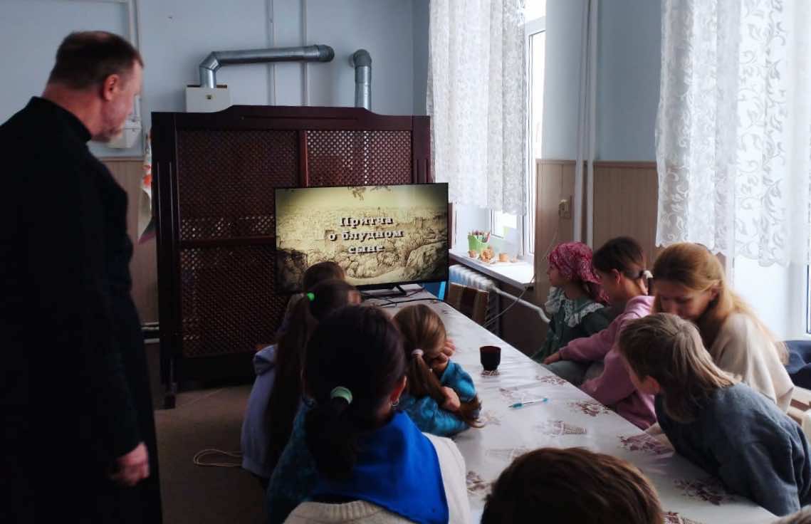 После Божественной Литургии в трапезной храма состоялось чаепитие. Настоятель протоиерей Борис Кекеев рассказал ребятам о подготовке к Великому посту, о том, почему в этот день Церковь напоминает нам о Страшном Суде, а затем воспитанники посмотрели фильм, посвященный Неделе о блудном сыне. На музыкальном занятии ребята продолжили разучивать новые песни: главный стимул — потом петь их всем вместе на слетах у костра.