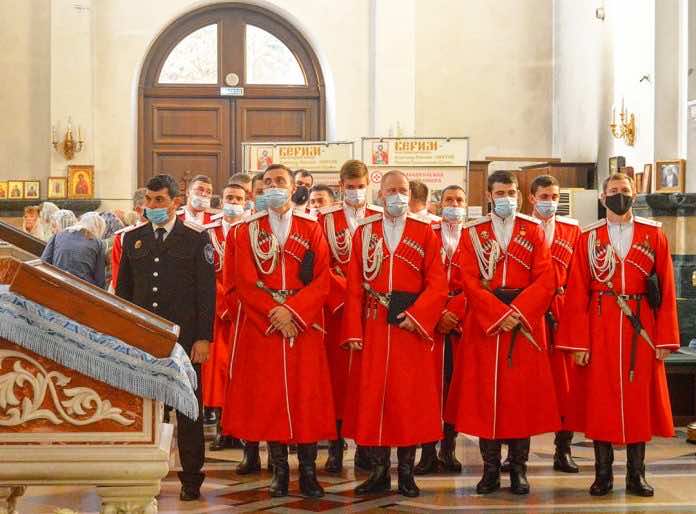 14 октября 2020 года в праздник Покрова Пресвятой Богородицы казаки Кубанского казачьего войска, почётный караул Кубанского казачьего войска, лидер Союза казачьей молодежи Кубани Владимир Бутенко помолились за Божественной литургией в Александро-Невском Войсковом соборе города Краснодара.