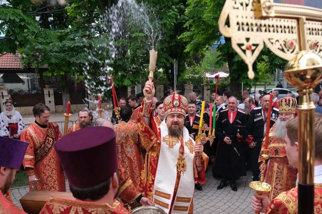 Как и всю Светлую Пасхальную седмицу, по окончании Литургии прошел праздничный крестный ход вокруг собора. Казаки несли хоругви, духовенство во главе с митрополитом Григорием – иконы, радостные пасхальные песнопения звучали в исполнении Кубанского казачьего хора. Владыка Григорий щедро окропил всех святой водой – в том числе и многочисленный казачий строй, пройдя вдоль него.