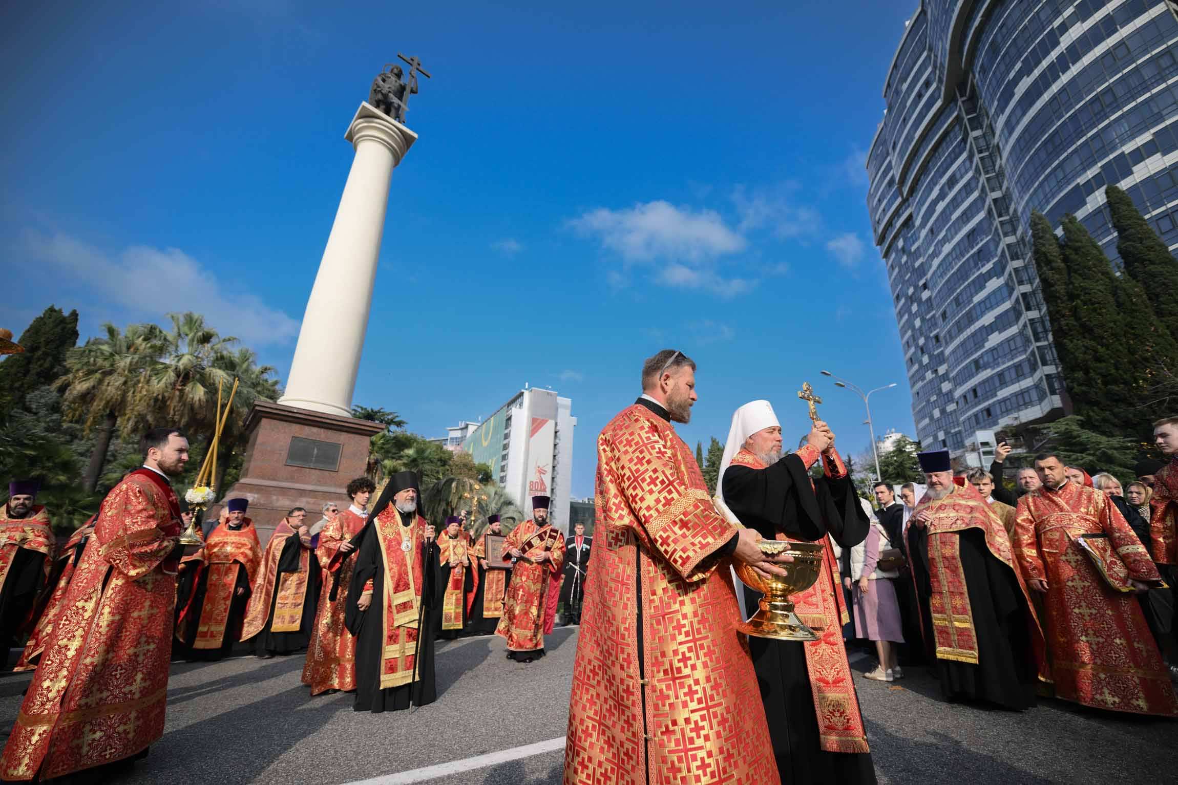 Перед монументальной колонной со скульптурой небесного покровителя Сочи, главы Небесного воинства Архангела Михаила митрополит Василий прочитал молитву о Святой Руси.