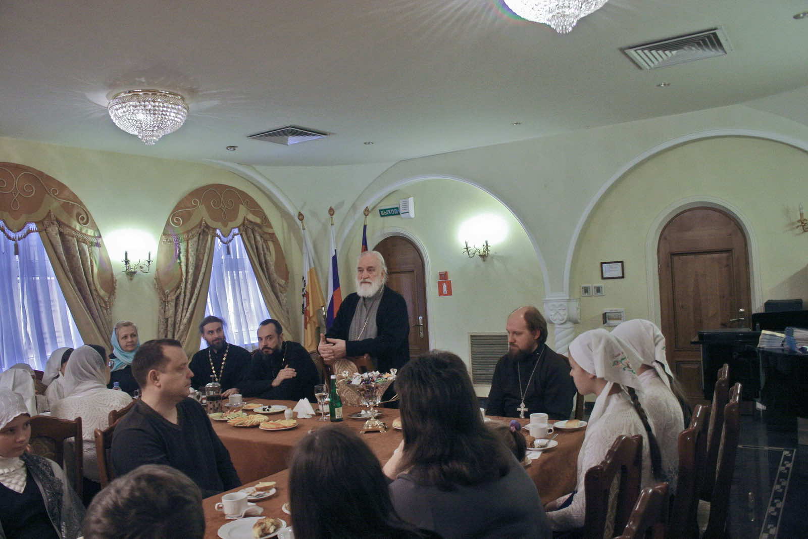 После чаепития, руководитель воскресной школы иерей Максим Ханов кратко представил всех участников встречи и обратился к митрополиту Павлу с просьбой рассказать что-нибудь интересное и полезное из личной истории его архипастырского служения.