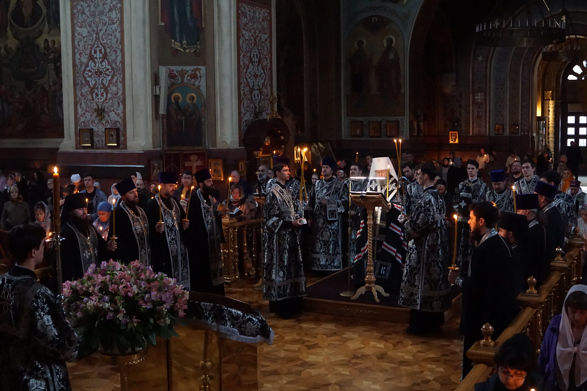 Вечером 25 марта 2026 года, в канун четверга 5-й седмицы Великого поста, митрополит Екатеринодарский и Кубанский Василий совершил утреню с чтением Великого покаянного канона преподобного Андрея Критского и жития преподобной Марии Египетской в Свято-Екатерининском кафедральном соборе города Краснодара.