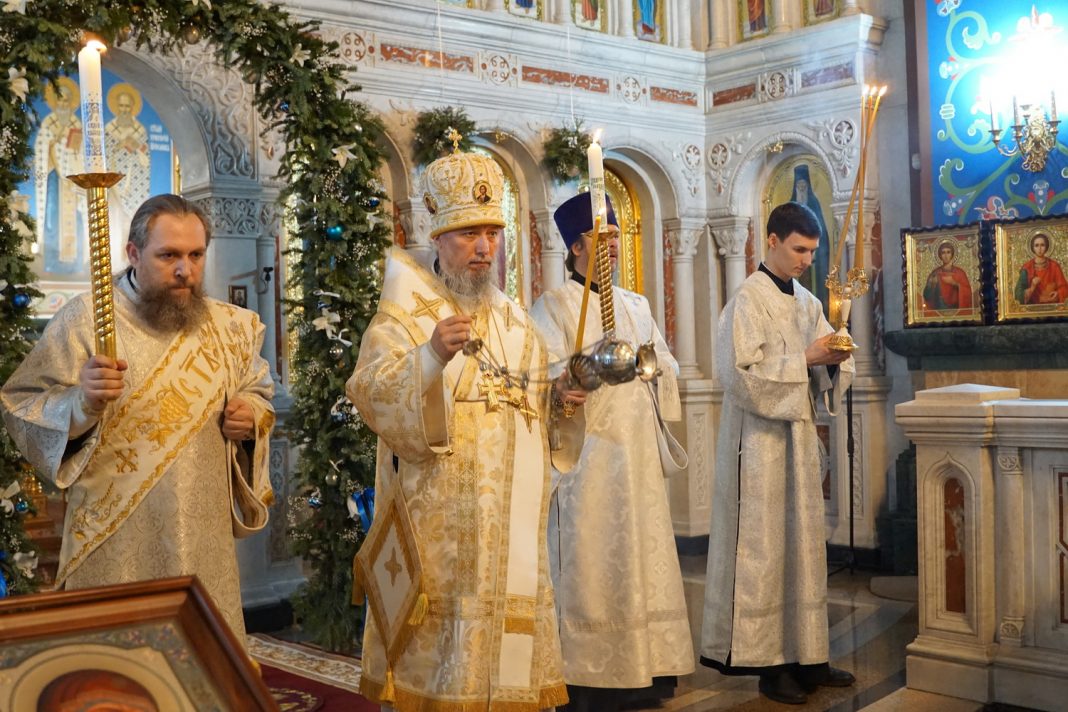 Его Высокопреосвященству сослужили: настоятель собора протоиерей Иоанн Гармаш, иерей Рафаил Резниченко, иерей Александр Клочков, иерей Вячеслав Феер, иерей Николай Симора, иеромонах Александр (Дерягин), иеромонах Даниил (Дерягин), иерей Вячеслав Миронов, иерей Олег Попов, диакон Андрей Тесля, протодиакон Максим Кадуров, диакон Никита Мельничук.