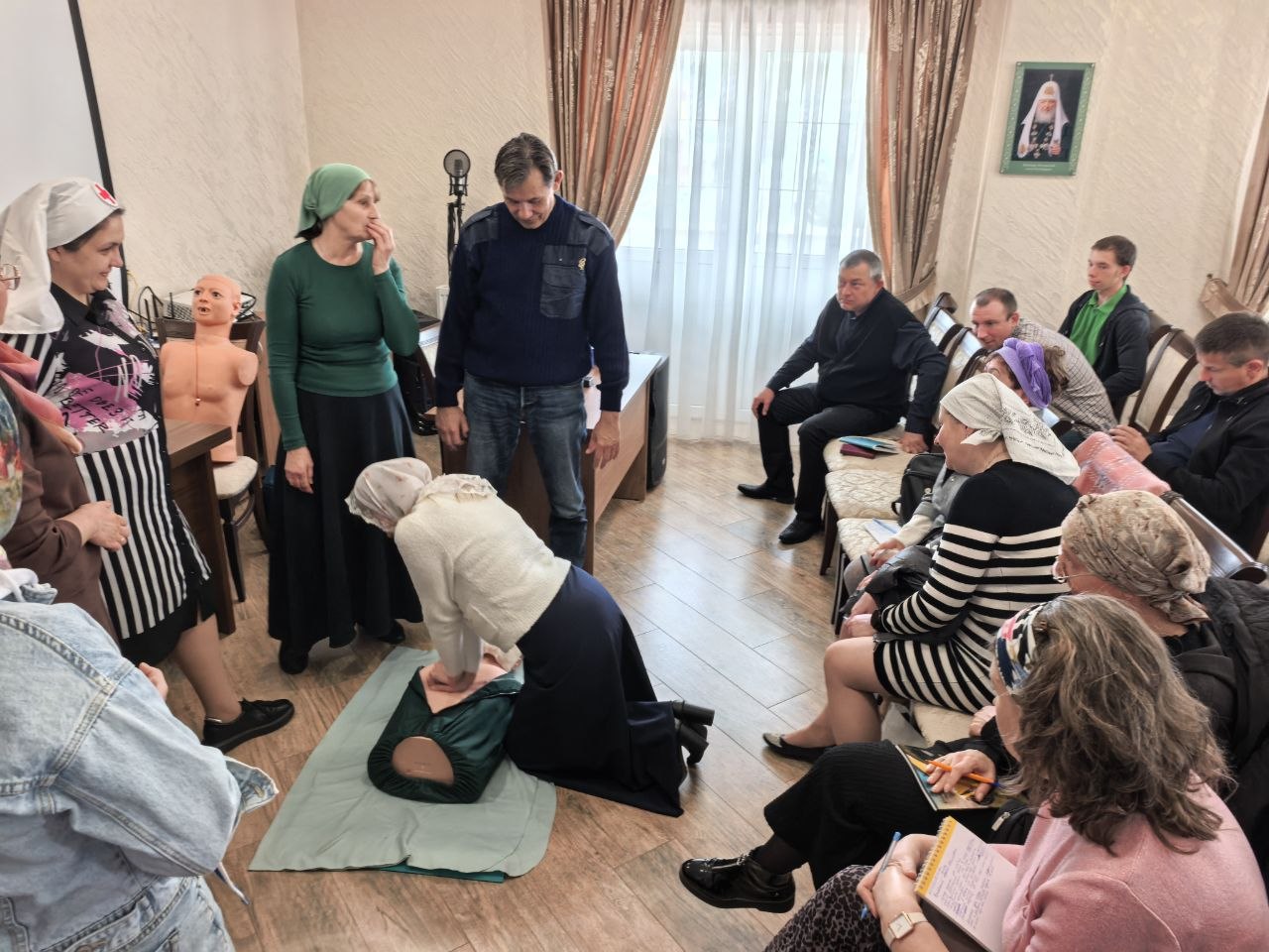 Очередное, уже второе по счёту, занятие состоялось на базе духовно-просветительского центра храма Святой Троицы. Основными темами стали инъекции и непрямой массаж сердца. Присутствующие внимательно слушали преподавателя, задавали вопросы и практиковались на специальных манекенах, которые максимально точно соответствуют реальным размерам, мягкости кожи и другим параметрам. Сёстры милосердия также приняли активное участие в отработке навыков.