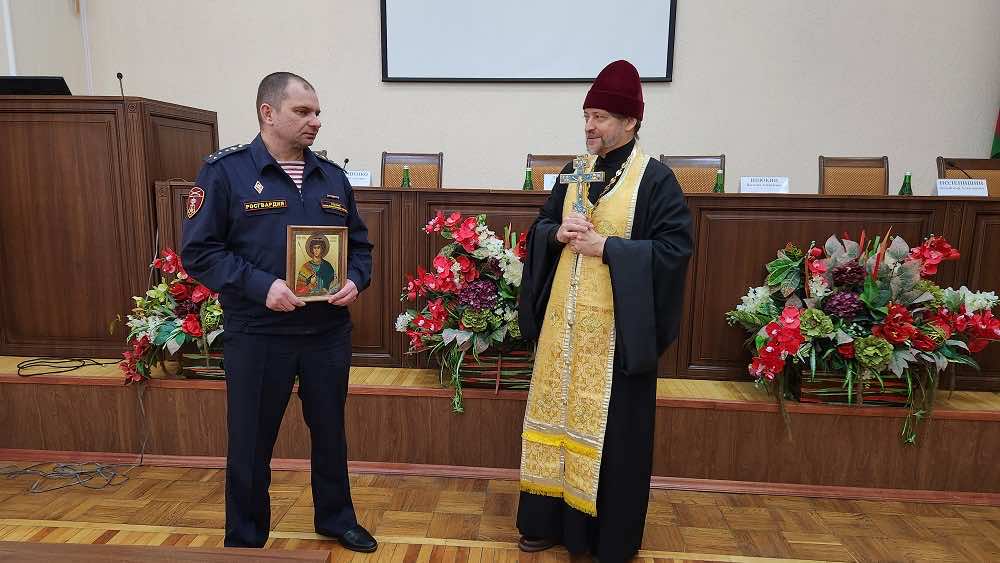 Священник обратился к присутствующим с приветственным словом и поздравил личный состав. Затем отец Александр зачитал молитву «Царю Небесный» и благословил Максима Викторовича на успешное выполнение возложенных служебно-боевых задач, а также вручил новому начальнику Росгвардии икону святого великомученика Георгия Победоносца.