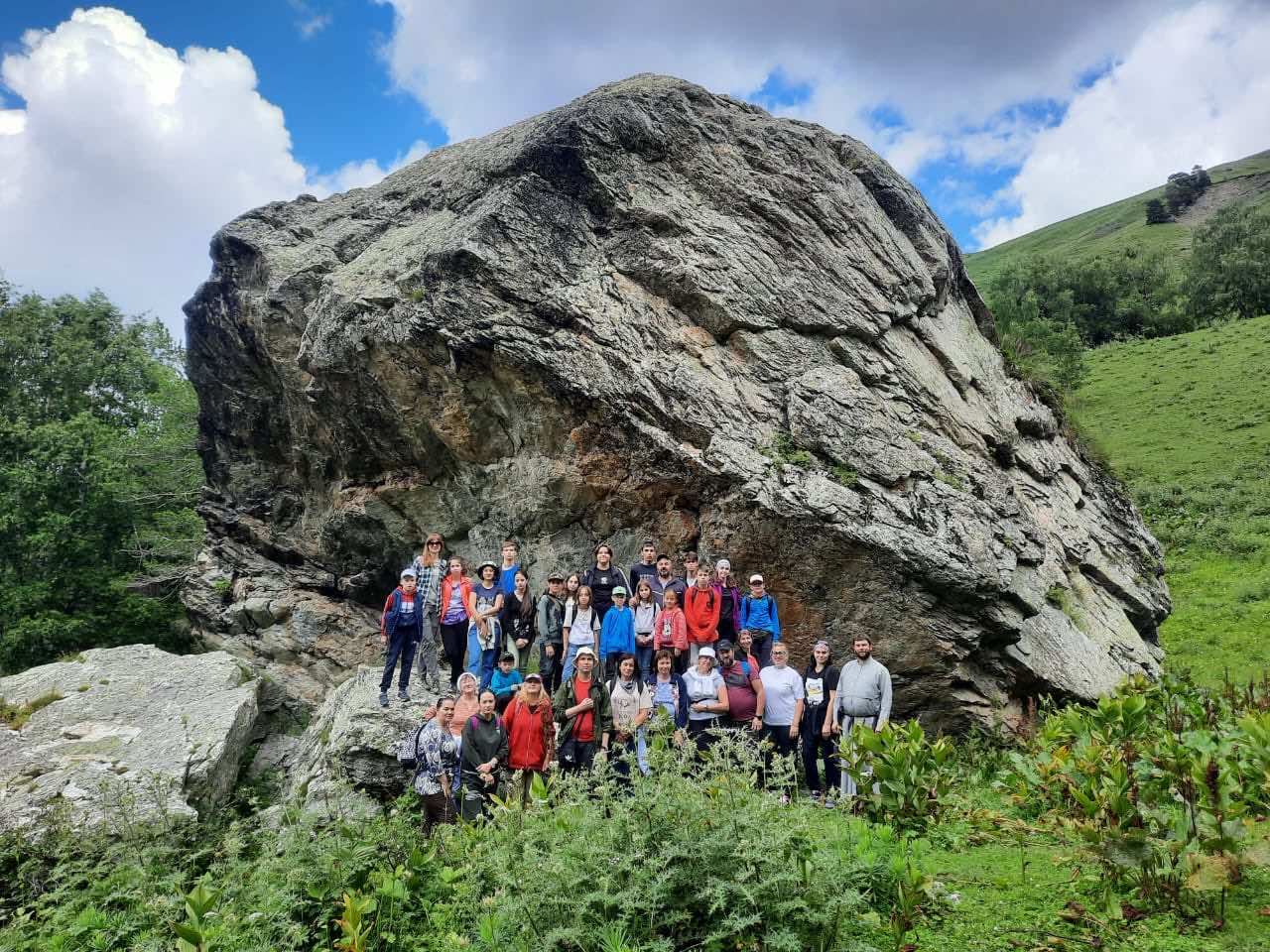 Утром путешественники снова отправились в путь. В этот день целью экскурсии стала церковная поляна – памятник историко-культурного наследия, находящийся на левом берегу реки Большой Зеленчук. Ещё в начале прошлого века учёными было обнаружено, что на поляне стояла церковь с садом, к сожалению, разрушенная полностью, но в лесу можно встретить обломки надгробных плит с греческими надписями и высеченными крестами. Сохранился и столб, на котором высечен большой христианский крест. Такие кресты располагались по углам разрушенной церкви. На оставшемся фундаменте храма отец Иоанн совершил молебен.
