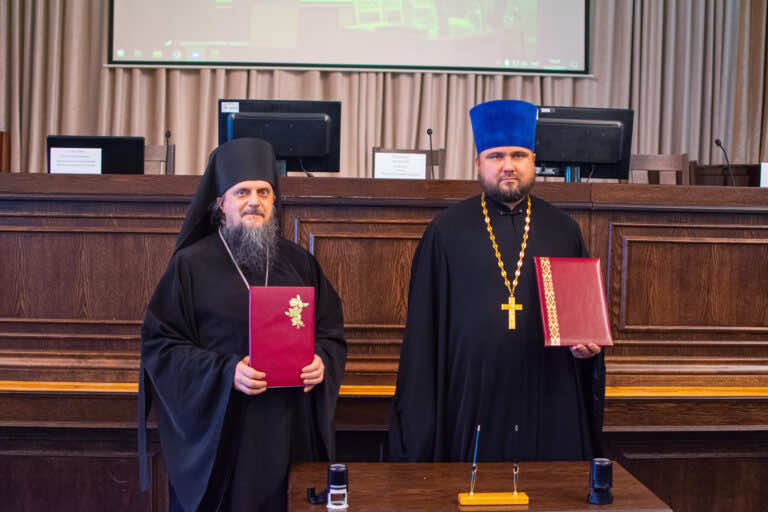 Подписали документ о сотрудничестве ректоры учебных заведений — архимандрит Афанасий (Соколов) и протоиерей Михаил Литвинко.