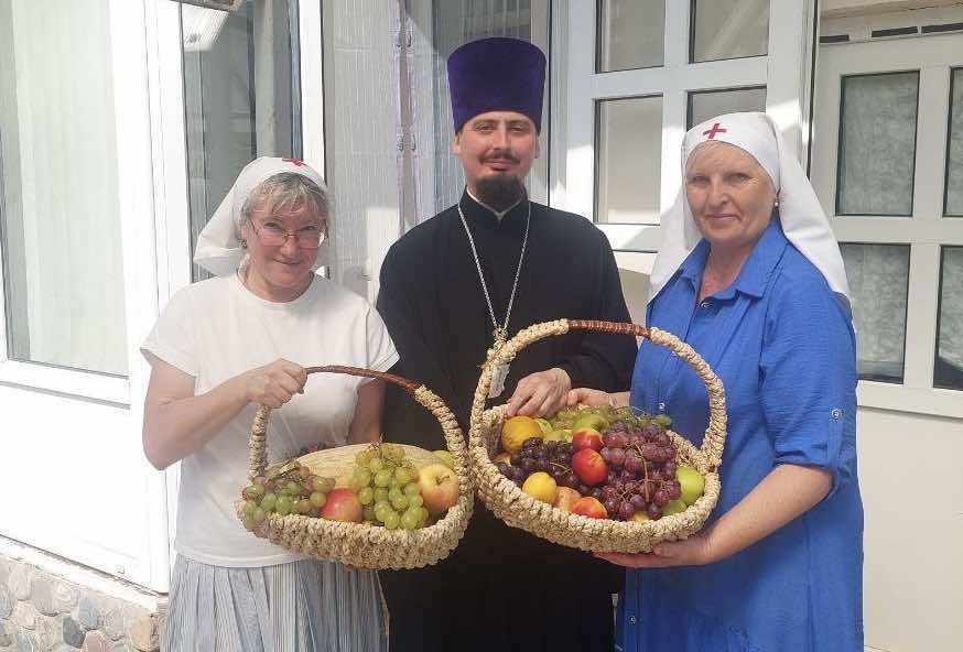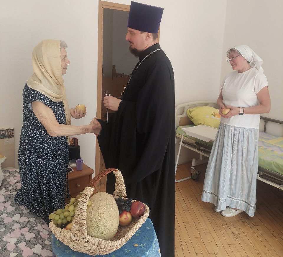 От лица настоятеля, священнослужителей и прихожан храма святого преподобного Сергия Радонежского отец Константин и сестры милосердия поздравили подопечных пансионата и подарили освящённые плоды нового урожая.