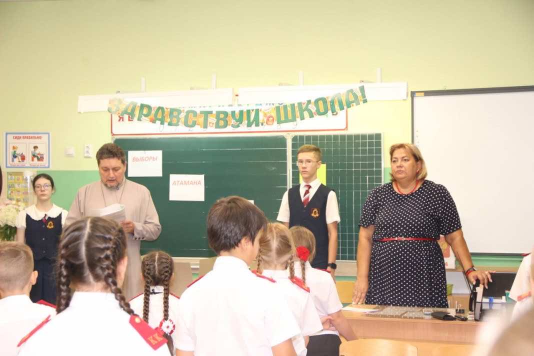 Штатный клирик храма Покрова Пресвятой Богородицы протоиерей Николай Юдин встретился с казачатами гимназии № 40. Священник посетил казачий 3 «Б» класс, где прошли выборы атамана класса. Отец Николай прочел молитву на начало учебного года, напутствовал и благословил детей.
