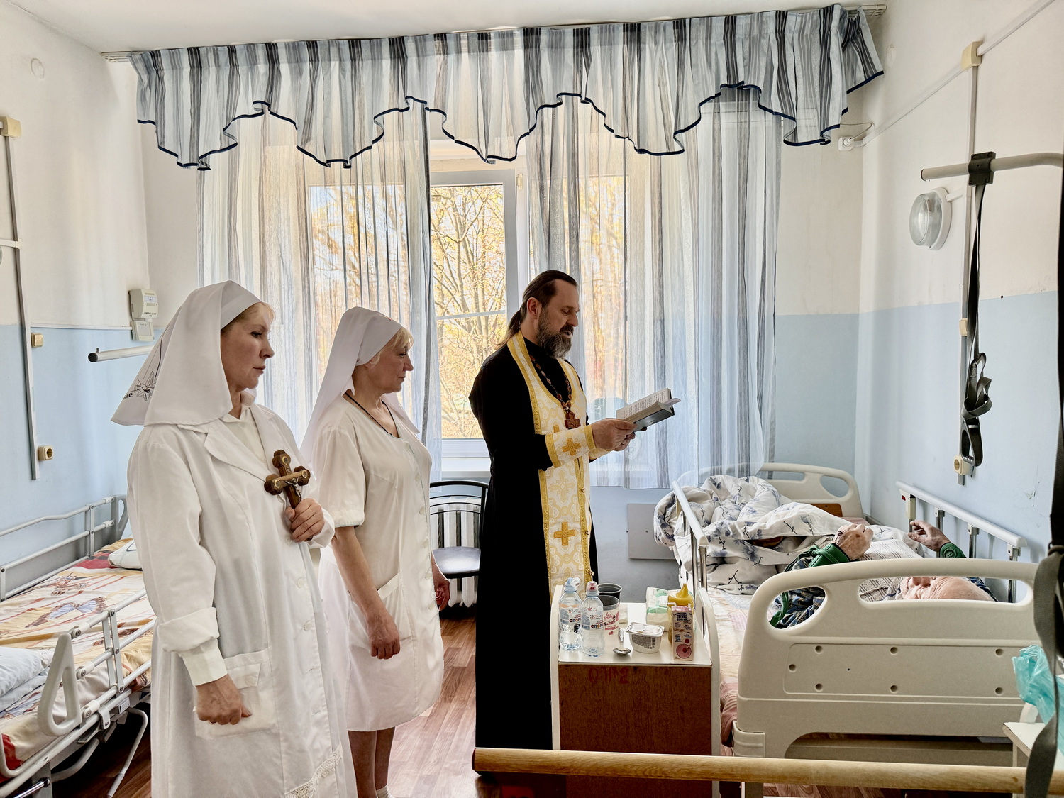 Отец Сергий тепло поздравил сотрудников и медперсонал учреждения с наступающим праздником, пожелав помощи Божией и покровительства Пресвятой Богородицы в благих делах. По традиции священник совершил Чин Елеосвящения. Каждому пациенту священник сказал добрые слова и пожелания. Сестры милосердия помогали священнику и усердно молились вместе с ним о здравии болящих.