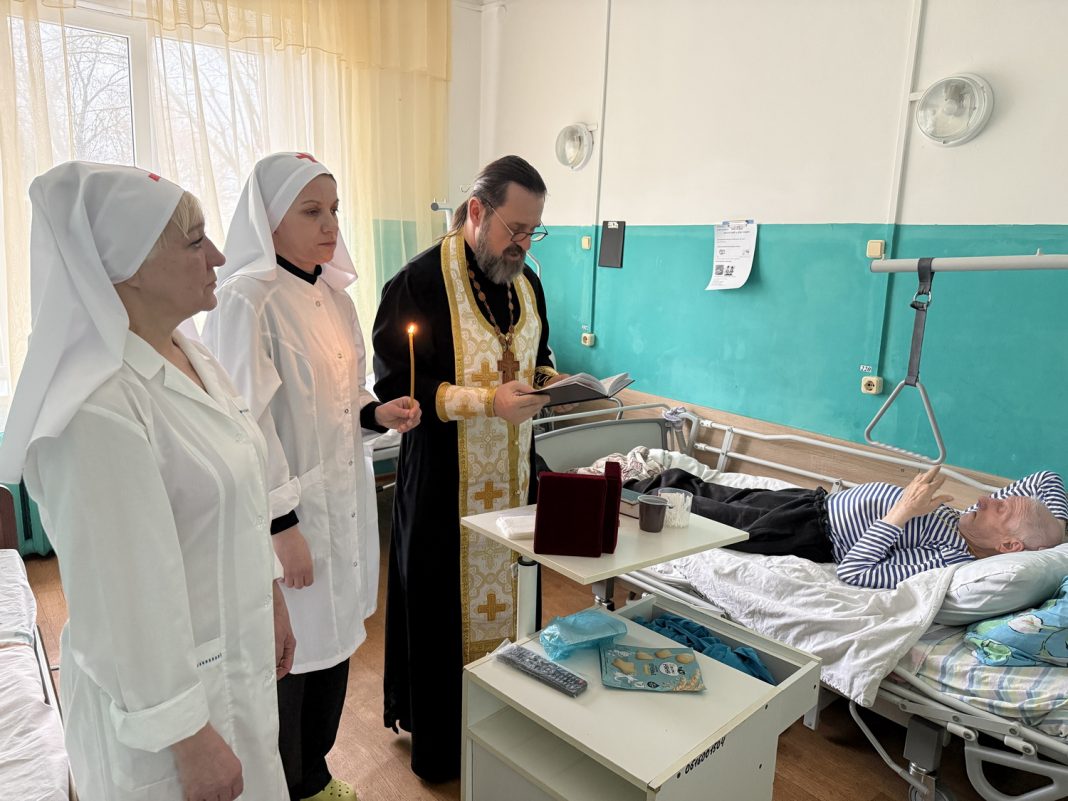 Отец Сергий тепло поздравил сотрудников и подопечных хосписа с праздником, пожелав мужчинам крепости духа, здоровья, Божией помощи. Затем священник совершил Чин Елеосвящения, в котором приняли участие 7 человек. За богослужением усердно молились и помогали сестры милосердия.