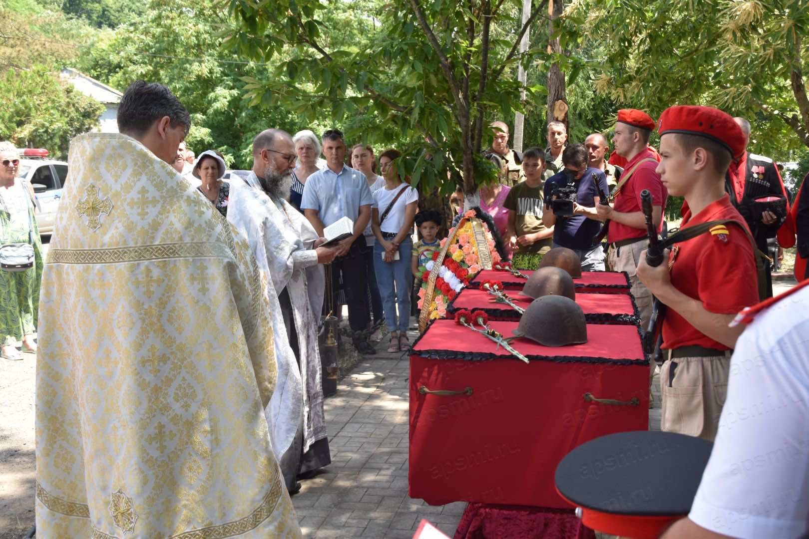 После траурного митинга состоялся чин погребения останков советских воинов, который совершили настоятель храма Георгия Победроносца г. Хадыженска иерей Илья Ванюхин и настоятель храма-часовни Преображения Господня в посёлке Новый Городок станицы Куринской иерей Евгений Шевцов.