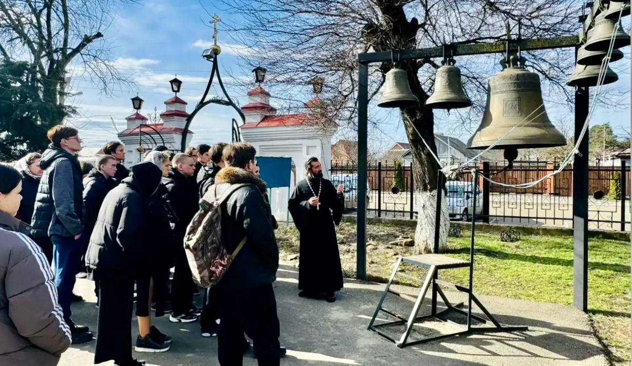Встретил юношей и девушек настоятель храма иерей Павел Максимец. Священник рассказал гостям о храме и его святынях, упомянул о том, что наши предки-казаки построили такой величественный храм в станице, потому что твёрдо верили в Бога и хотели, чтобы казачий род умножался и наполнял этот храм.