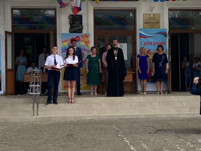 Сегодня в общеобразовательной школе № 47 г. Краснодара прошло торжественное мероприятие, посвященное Дню знаний. На него был приглашен священник храма святителя Спиридона Тримифунтского г. Краснодара иерей Александр Шигалев.