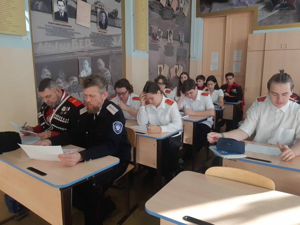 Старшеклассники из казачьих классов школы № 8 приняли участие в этом мероприятии. Перед диктантом ребят благословил и выступил с напутственным словом духовник казачат, штатный священник Свято-Сергиевского храма протоиерей Иоанн Воронов. Свое пожелание учащимся сказала и директор школы Лидия Ивановна Цымбал. Она пожелала им без волнений и тревог погрузиться в процесс написания диктанта. Также пожелал детям удачи атаман из хуторского-казачьего общества «Красный кут».