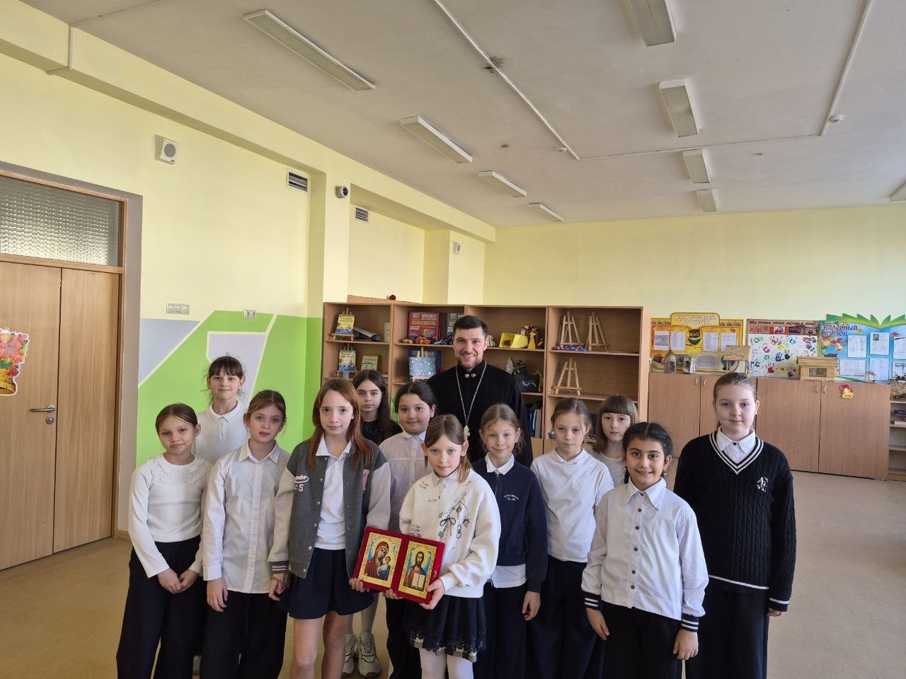 Встреча прошла в теплой и доверительной атмосфере и вызвала живой интерес у учащихся. После урока отец Давид подарил ученикам 3 «Ж» класса икону Пресвятой Богородицы и Господа нашего Иисуса Христа.