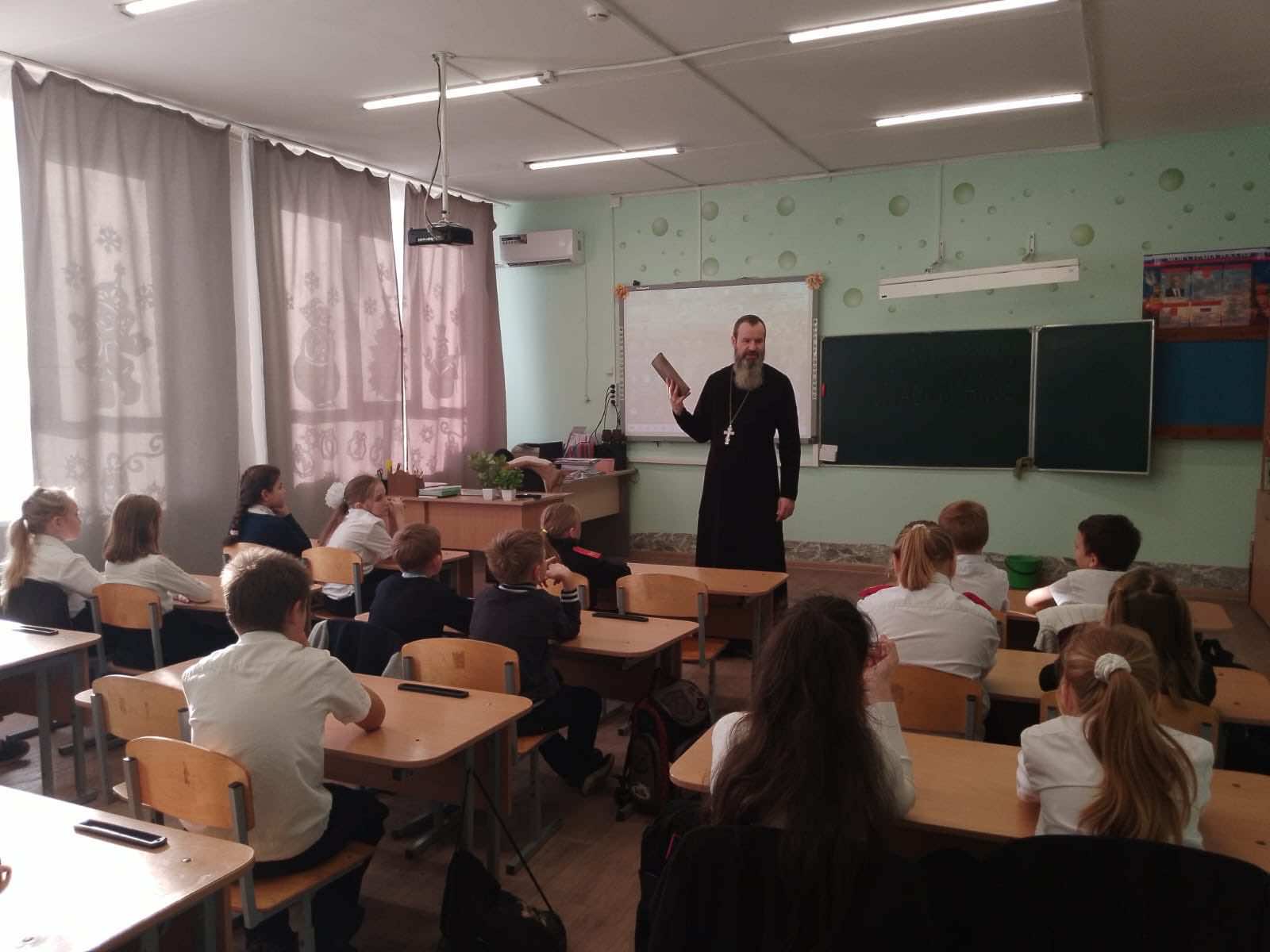 23 декабря настоятель храма Рождества Пресвятой Богородицы села Львовского иерей Сергий Коваленко провёл урок в классе казачьей направленности СОШ № 32 села Михайловского.