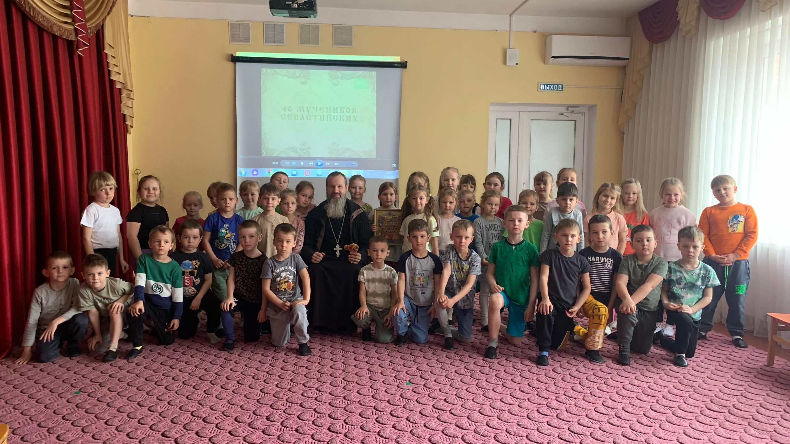 В пятницу, 21 марта, настоятель храма Рождества Пресвятой Богородицы села Львовского иерей Сергий Коваленко провел беседу с воспитанниками детского сада № 18 села Львовского. Беседа была посвящена теме мужества и христианского подвига 40 Севастийских мучеников. Детям была предложена к просмотру передача о подвиге мучеников и анимационный фильм. После беседы отцу Сергию был подарен жаворонок, заботливо выпеченный сотрудниками детского сада. Также каждый ребенок получил жаворонка в подарок.