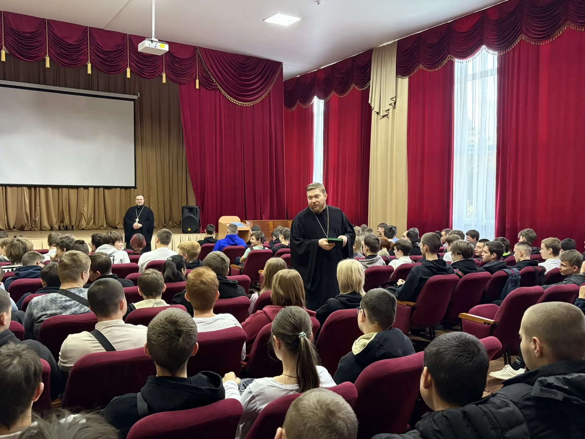 Иерей Дионисий Пылаев продолжил разговор, рассказав студентам о создании православной молодежной общины. Он поделился планами о том, как сегодня может жить молодая православная душа: совместные поездки, интересные встречи, душевные беседы и, конечно, возможность осмысленного общения. Важно, что слово священника упало на добрую почву — несколько человек изъявили желание записаться в общину.
