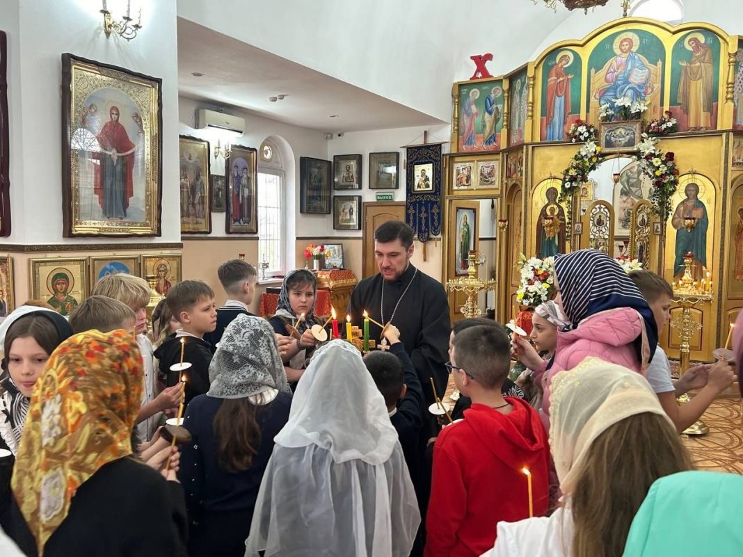 Настоятель храма иерей Давид Кочаров сердечно поздравил всех присутствующих со Светлой Пасхой. Отец Давид рассказал ребятам о Благодатном огне, и все присутствующие вознесли молитвы ко Господу со свечами, зажжёнными от Благодатного огня.