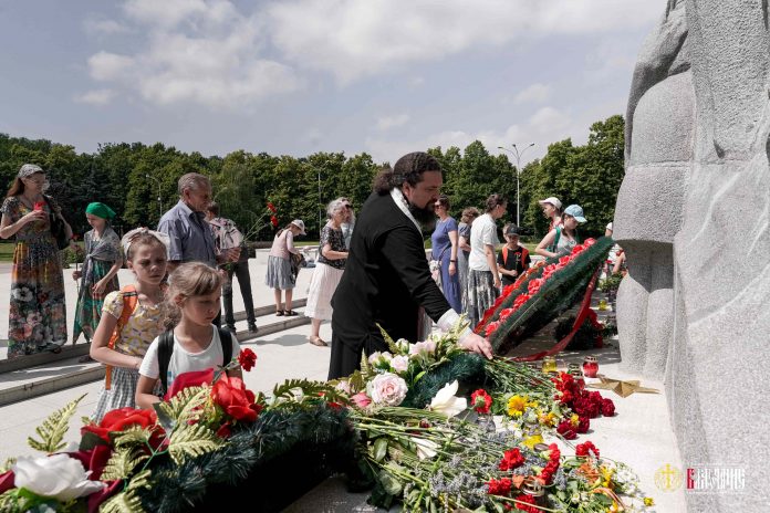 Школьников сопровождал благочинный 5-го городского благочиннического округа, настоятель храма святителя Спиридона иерей Иларион Максимец. Священник отслужил у памятника заупокойную литию об упокоении душ убитых соотечественников, затем дети и родители возложили к мемориалу цветы.