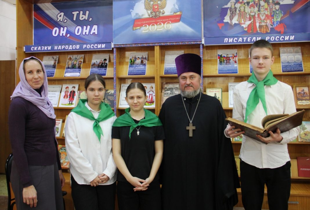 Специальными гостями мероприятия стали штатный священник Свято-Троицкого храма иерей Никифор и матушка Валентина Некрыловы. Отец Никифор рассказал ребятам о богослужебных книгах и показал «Апостол» и «Псалтирь» из личной библиотеки, чтобы сделать свой рассказ более наглядным. «О книгах нужно не просто разговаривать, важно их подержать в руках, полистать», — отметил священник. Также супруги побеседовали с ребятами о духовных ценностях и особо подчеркнули, насколько важно сохранять и развивать привычку чтения духовной литературы. В завершение встречи отец Никифор и матушка Валентина пожелали ребятам, чтобы книги отцов и учителей Церкви и впредь вдохновляли их на добрые и мудрые поступки.