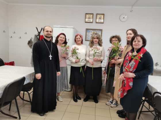 Штатный священник храма Святого Духа иерей Николай Козак поздравил женщин с праздником и подарил цветы.