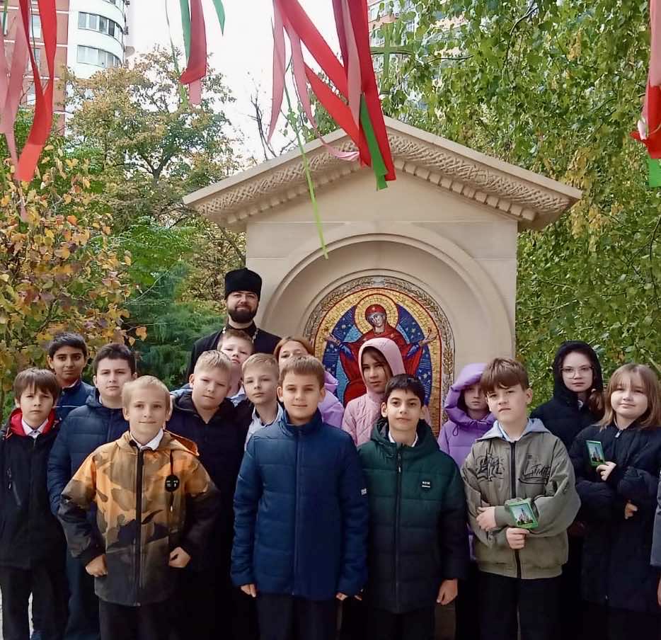 Школьники узнали об особенностях устройства православного храма, с вниманием изучили настенную роспись, выполненную в знаменитой палехской технике. Поговорили также о значении Креста Господня и о важнейших христианских праздниках.
