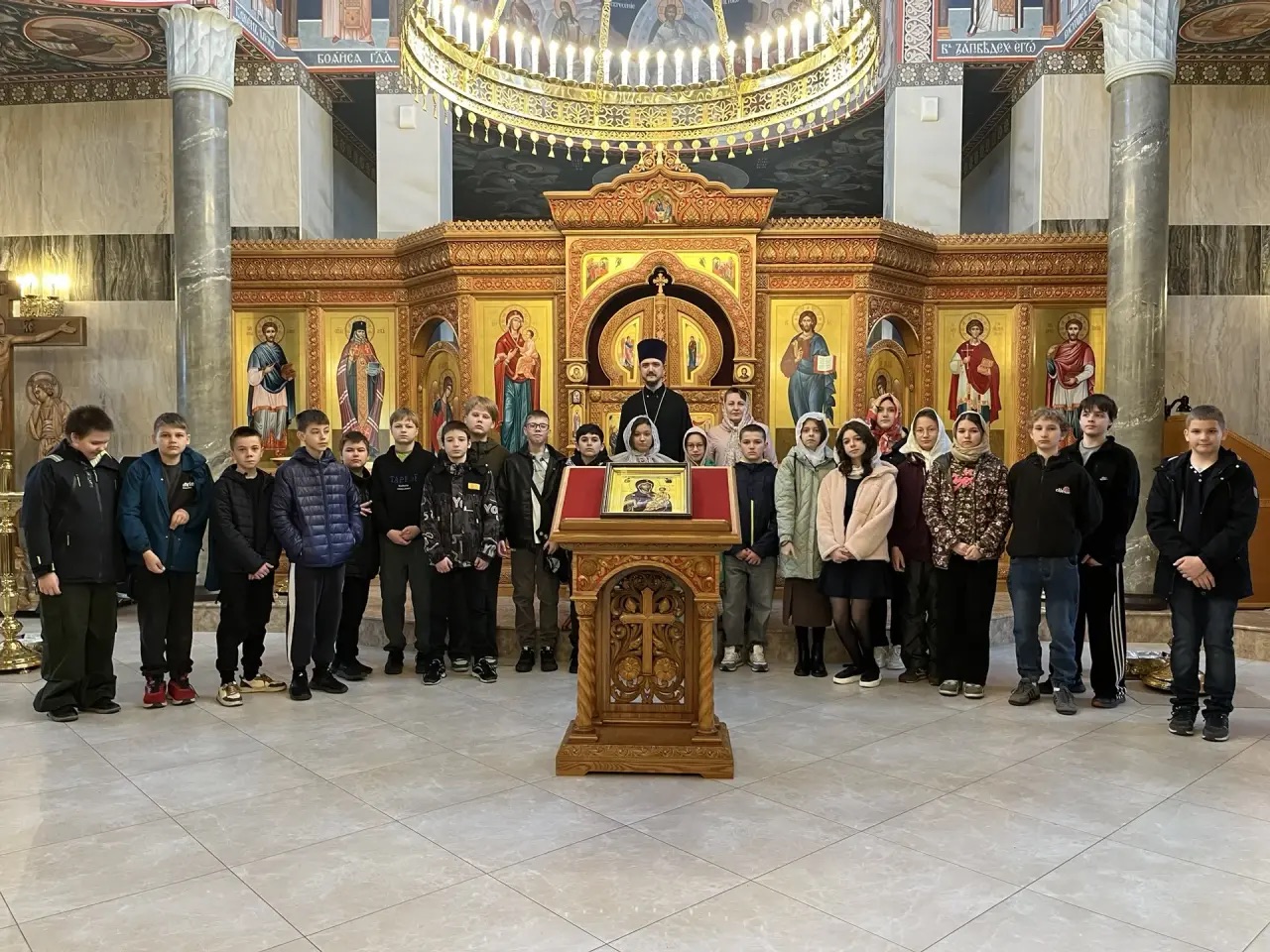 27 марта 2026 года по благословению настоятеля храма великомученика и целителя Пантелеимона г. Краснодара протоиерея Константина Капранова для учащихся 6 «М» класса МАОУ СОШ № 104 г. Краснодара была проведена экскурсия по храму.
