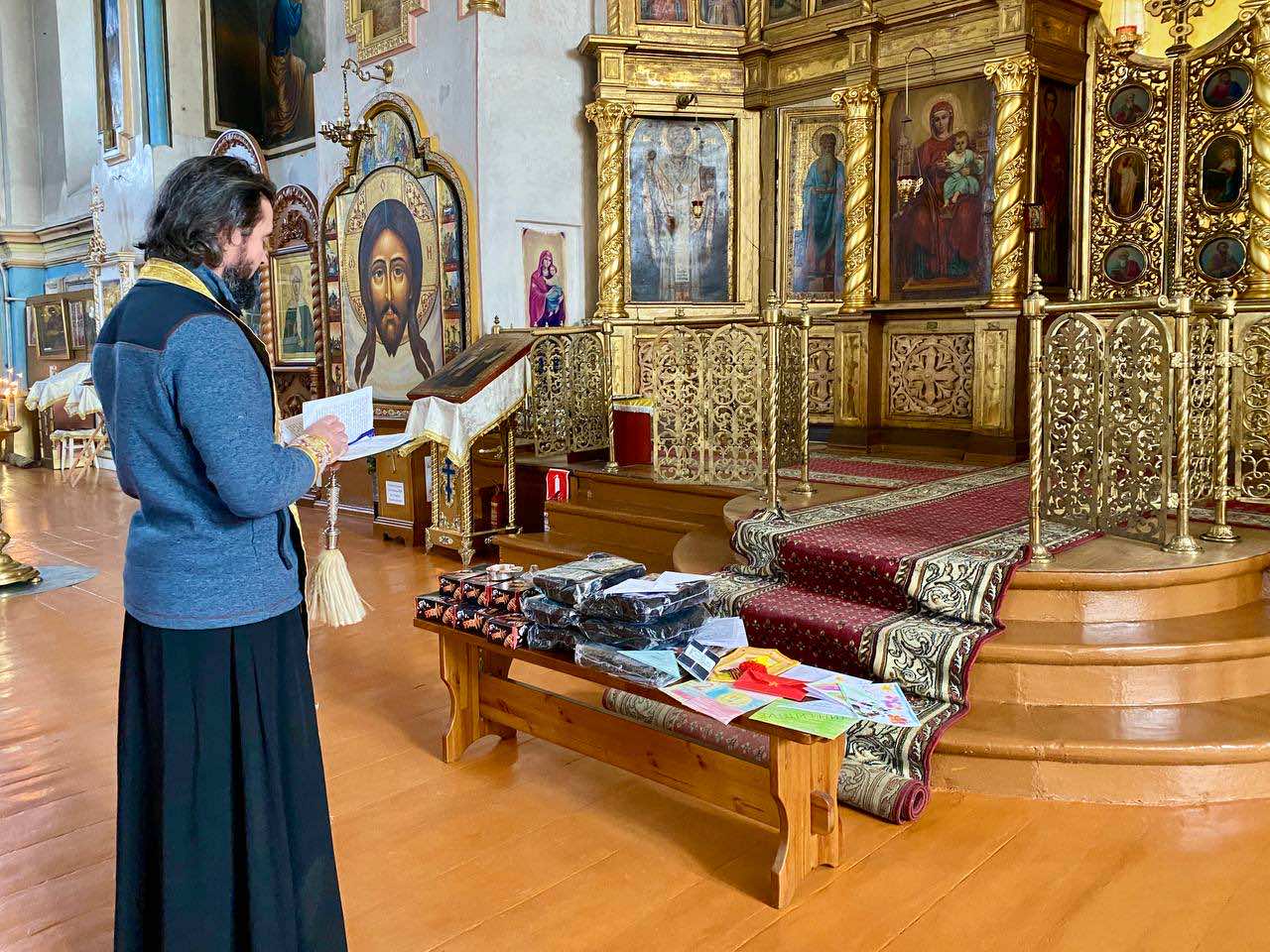 В День Защитника Отечества в храме Вознесения Господня ст. Пластуновской настоятель иерей Павел Максимец совершил благословение и окропил святой водой гуманитарную помощь, а также поздравительные открытки и письма для солдат, изготовленные воспитанниками воскресной школы.