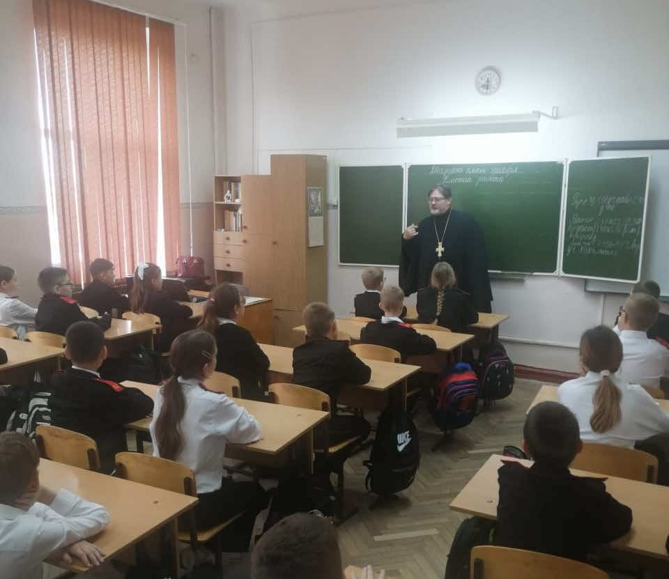 Беседа с учениками 1 класса была посвящена молитве. Священник рассказал о разных видах молитвы и о том, как нужно молиться в различных жизненных ситуациях. На мероприятии присутствовал преподавательский состав и наставник по казачеству.