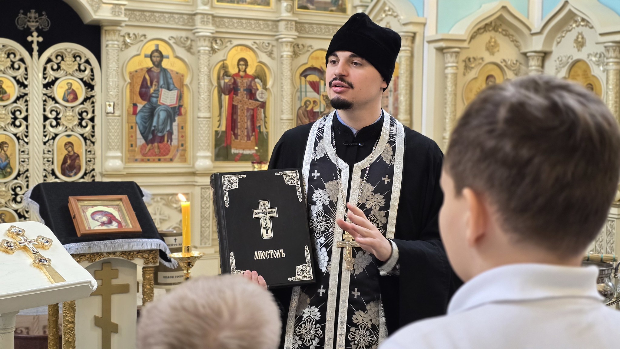 Школьников встречал иерей Иоанн Лапко. После совместного молебна священник погрузил ребят в удивительный мир древней книги. Главной темой разговора стало начало книгопечатания на Руси. Ребята узнали, что первая датированная печатная книга «Апостол» увидела свет в 1564 году.